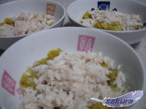 それで小分けして冷凍保存。毎日あげるときに、解凍してお肉を湯がいて上にかけて出来上がり。